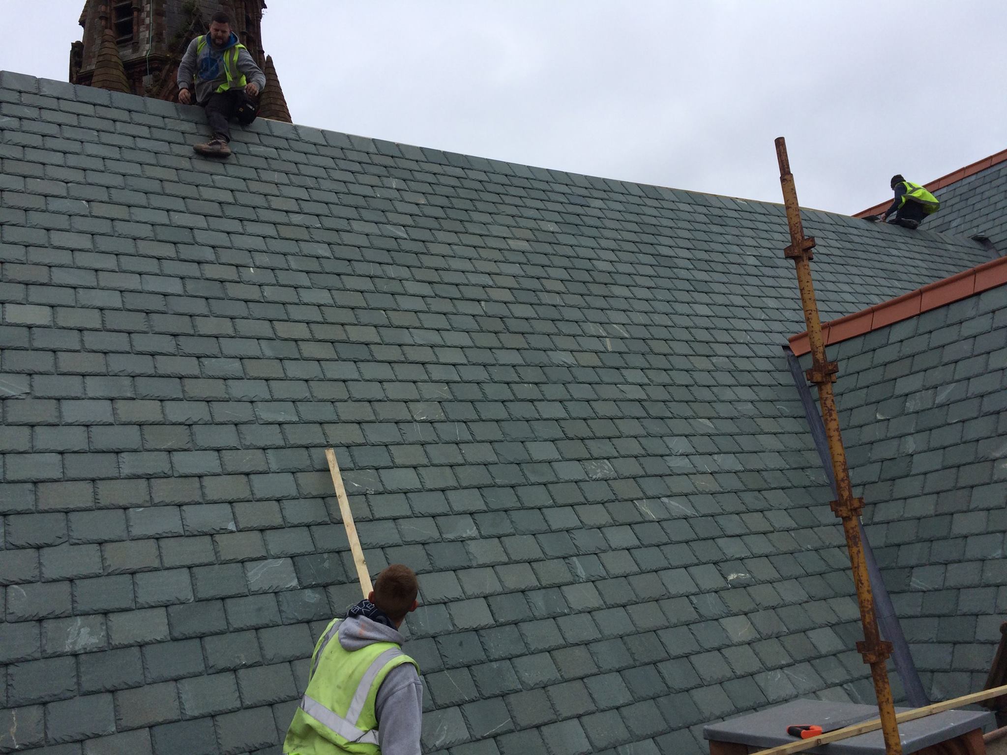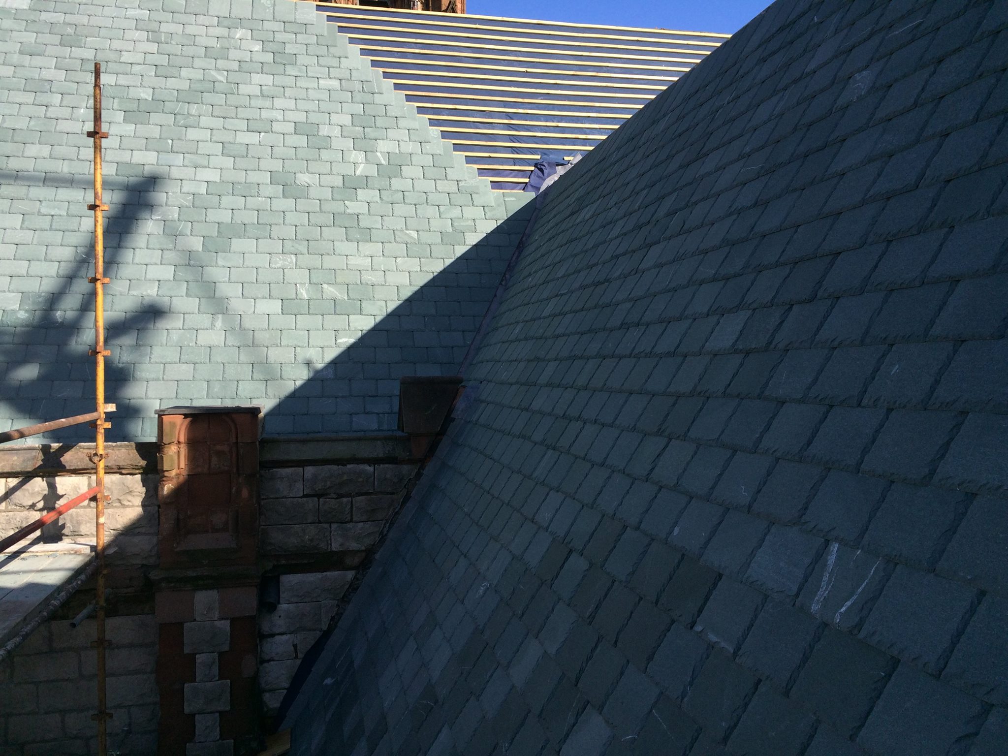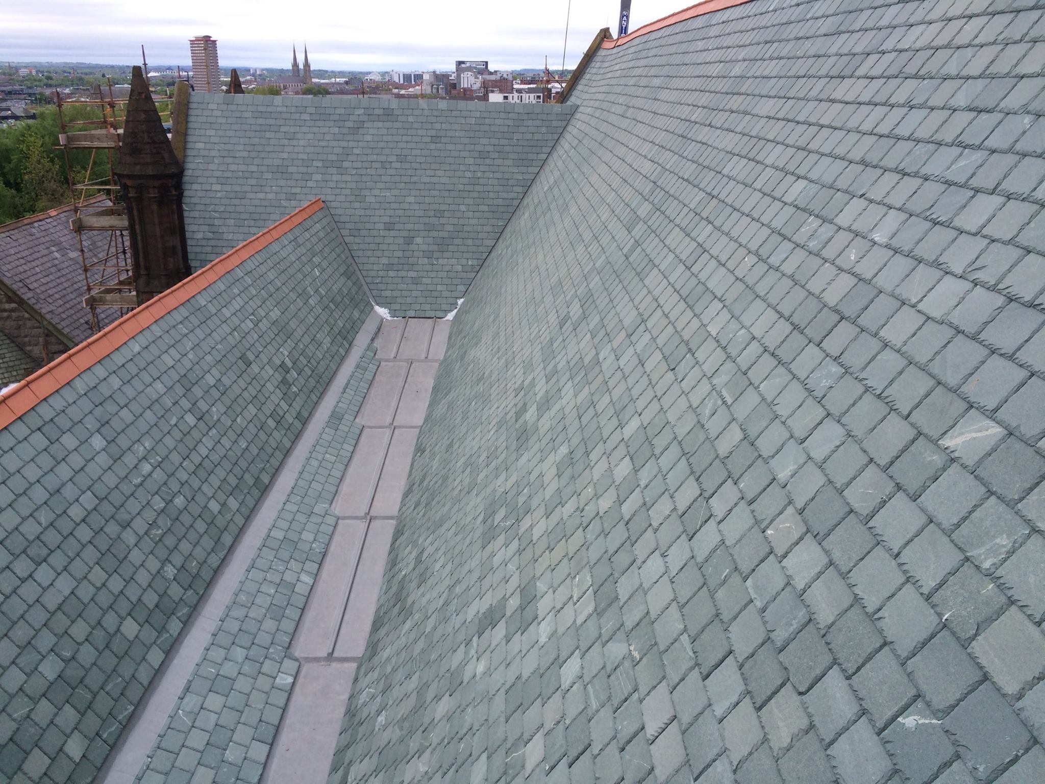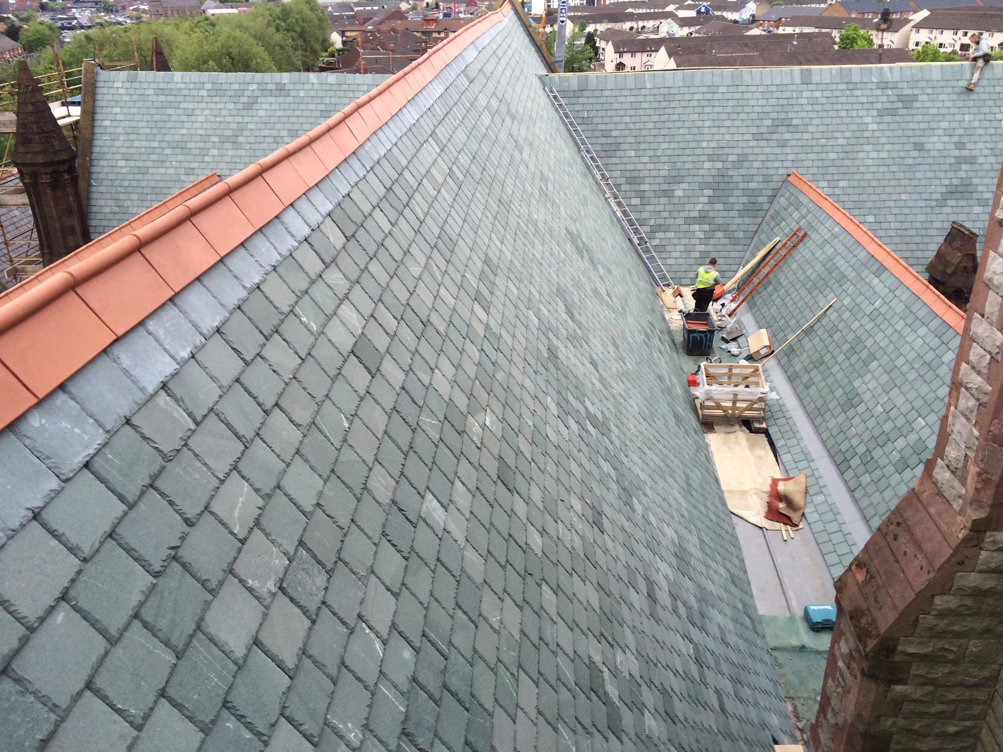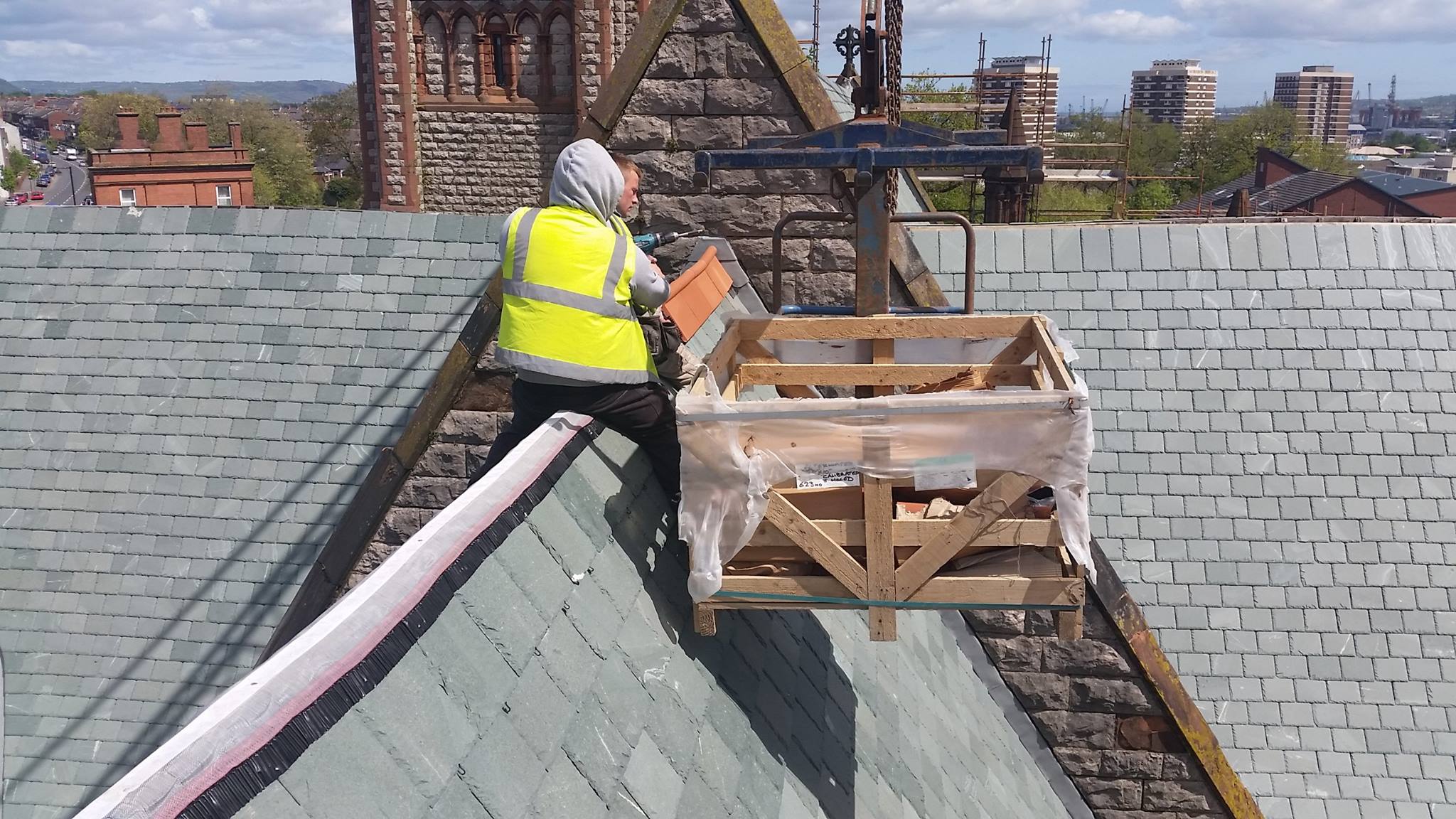 27,000 new Westmorland Green Roofing Slates for the re-slating of the historic Carlisle Memorial Church in North Belfast. The distinctive Grey/Green hue of the Westmorland slate is now once again visible on completed sections of the roof. It is, as far as we know, one of the largest Westmorland Green restoration projects, in Ireland, in the last ten years.