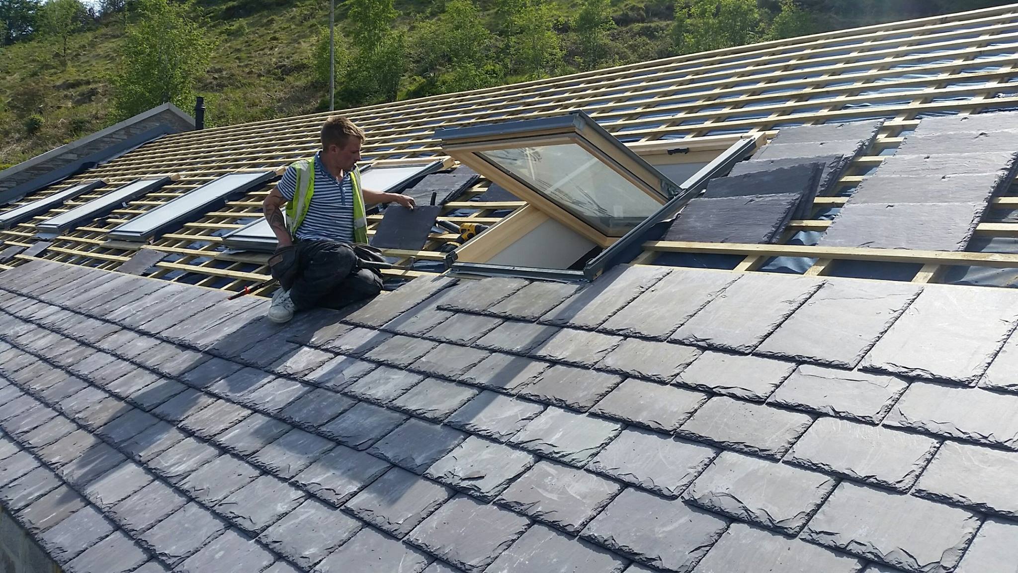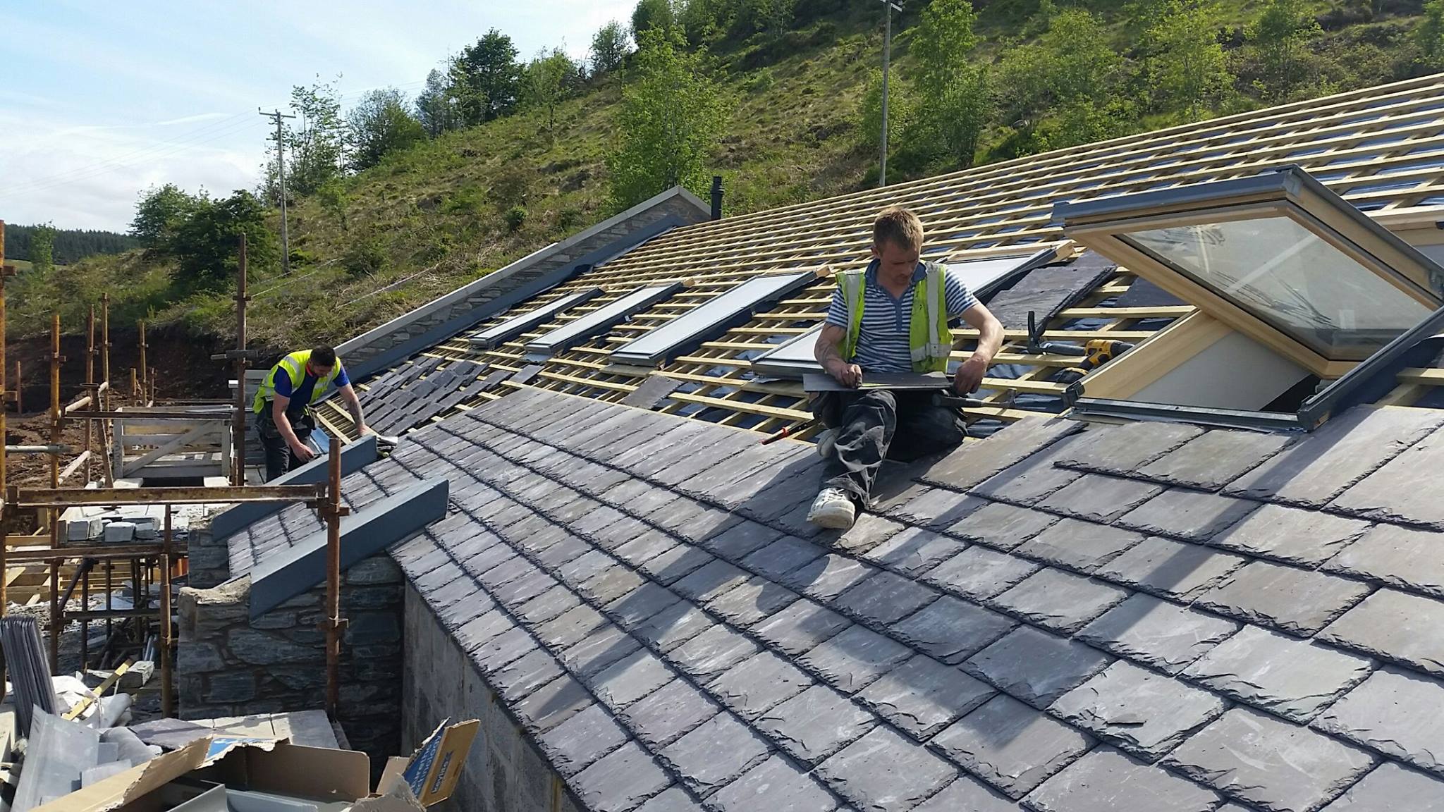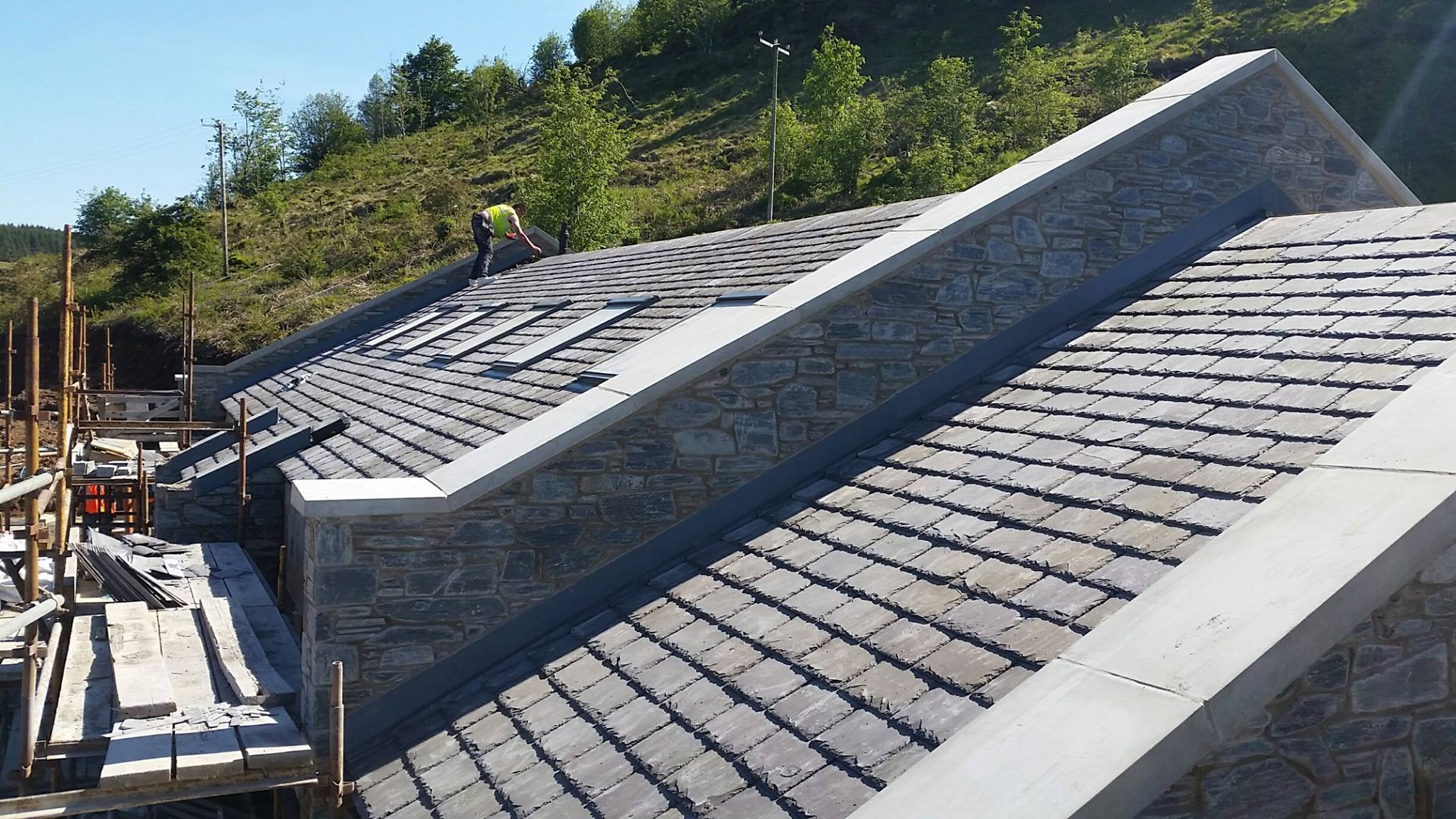 Sun shining in the scenic Glenariff forest as Valley Roofing slaters lay the finishing touches to the supply and fit of the new tourist centre with Bangor Blue Celtics.