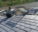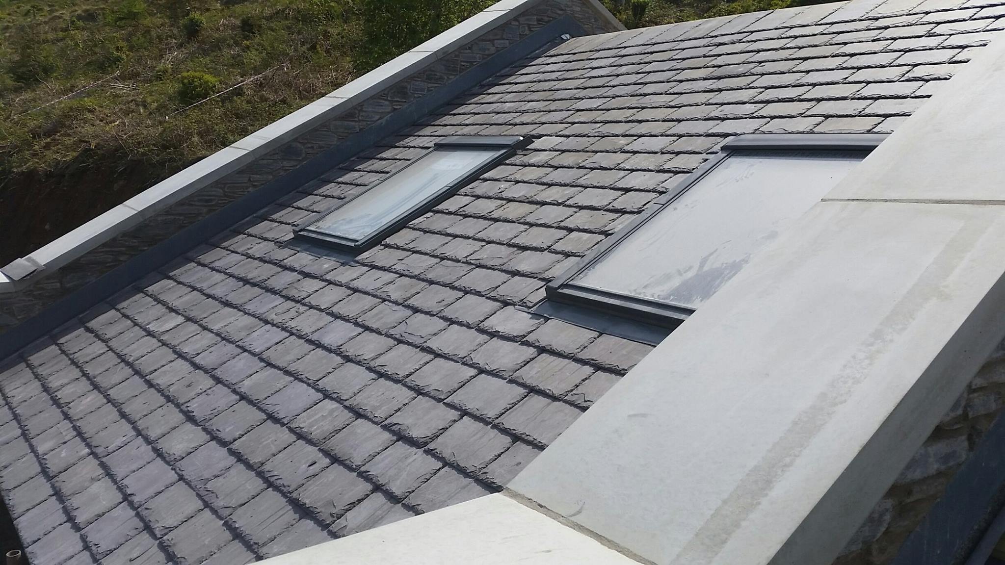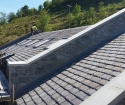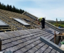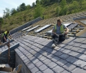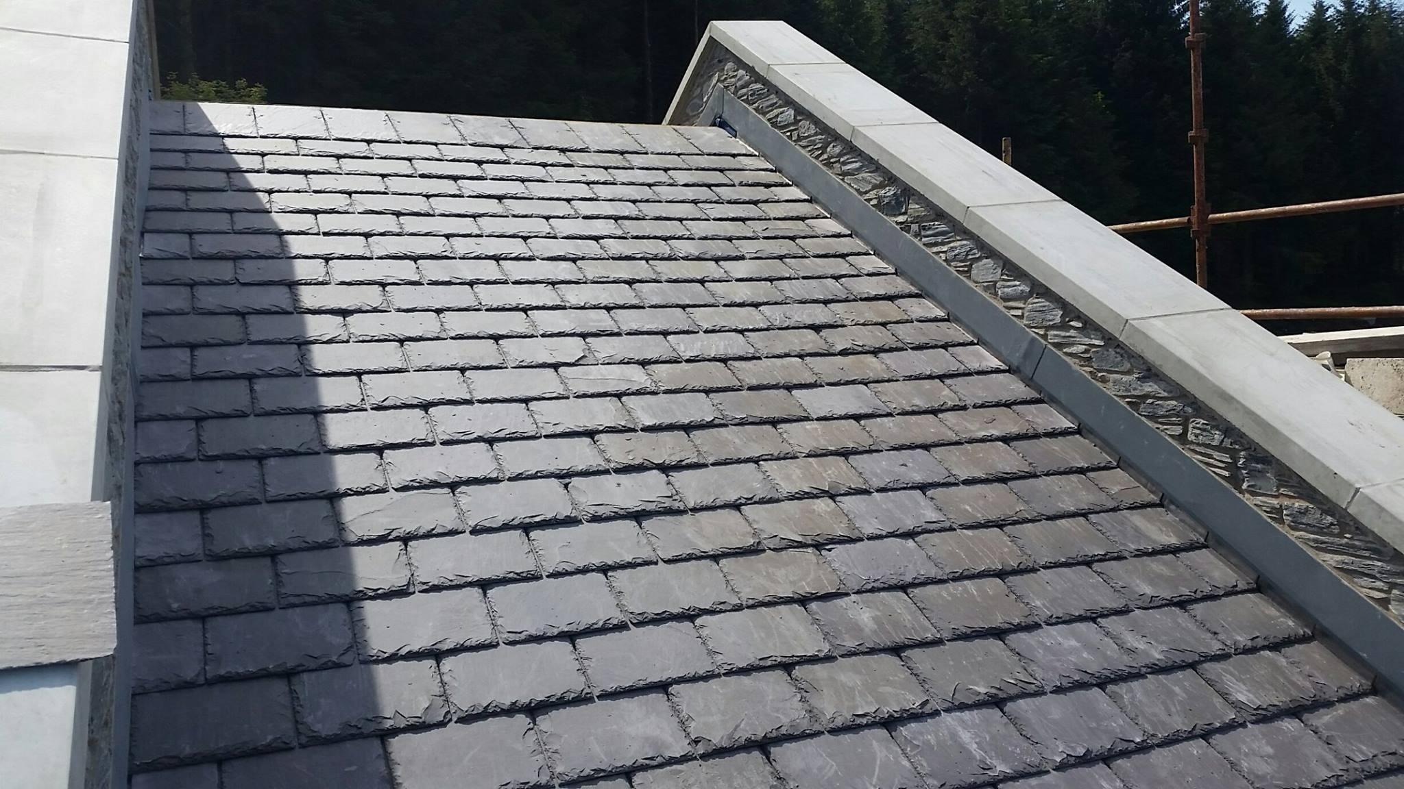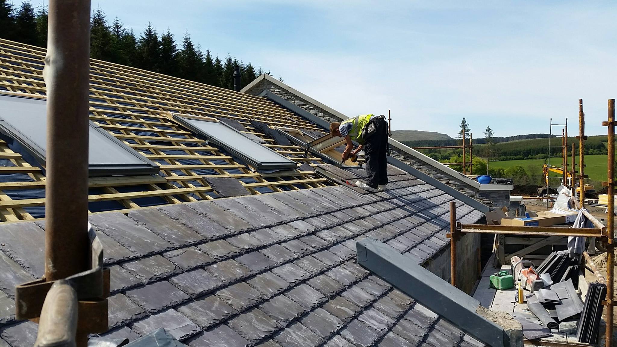 Sun shining in the scenic Glenariff forest as Valley Roofing slaters lay the finishing touches to the supply and fit of the new tourist centre with Bangor Blue Celtics.